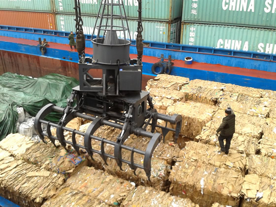 為港口吊配備大型機(jī)電液抓斗,抓紙捆卸船